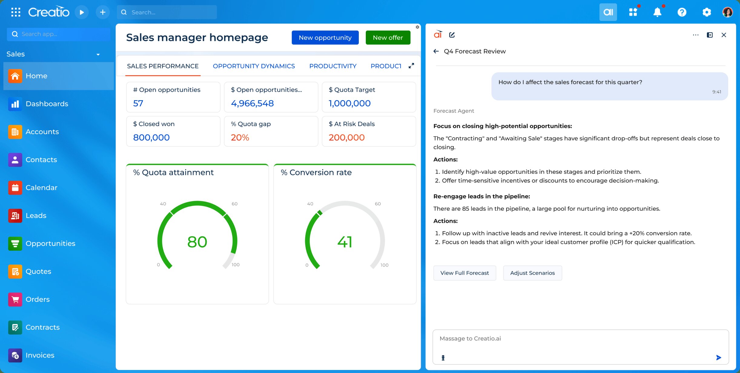 Creatio CRM products can be deployed as a single CRM bundle or as standalone solutions to fit your company’s exact needs, whether it’s complex B2B sales, e-commerce, partner relationship management, customer service, or all of the above. In addition to rich OOTB CRM features, Creatio CRM makes a strong emphasis on no-code tools for system and UI customization, workflow automation, AI\ML capabilities for predictive and prescriptive analytics, reporting, flexible dashboards, and many more. Also, there are hundreds of composable apps, ready-to-go solutions, and add-ons that can be downloaded for Creatio CRM from Creatio Marketplace.